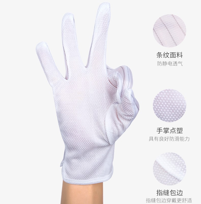 防靜電點塑手套又稱防靜電點塑防滑手套,是采用特種防靜電滌綸布制作而成,材質由滌綸和導電纖維組成,導電纖維間距為10mm,手心加上PVC防滑顆粒,防滑性好、耐磨性好,手套具有極好的彈性和防靜電性能,能避免人體產生的靜電對產品造成破壞,適合在電子行業、半導體、醫療生物、光伏、光學及無塵車間使用。