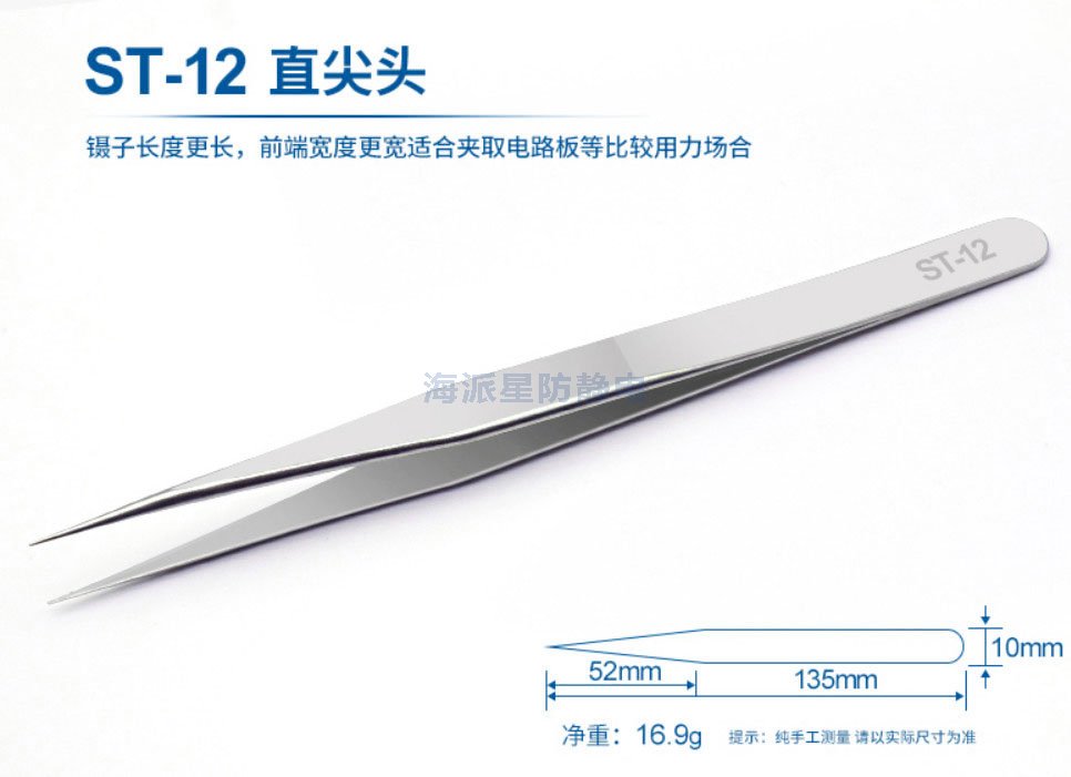 | ST-12 | 鑷子長度更長,前端寬度更寬,適合夾取電路板等比較用力場合 | ||||||